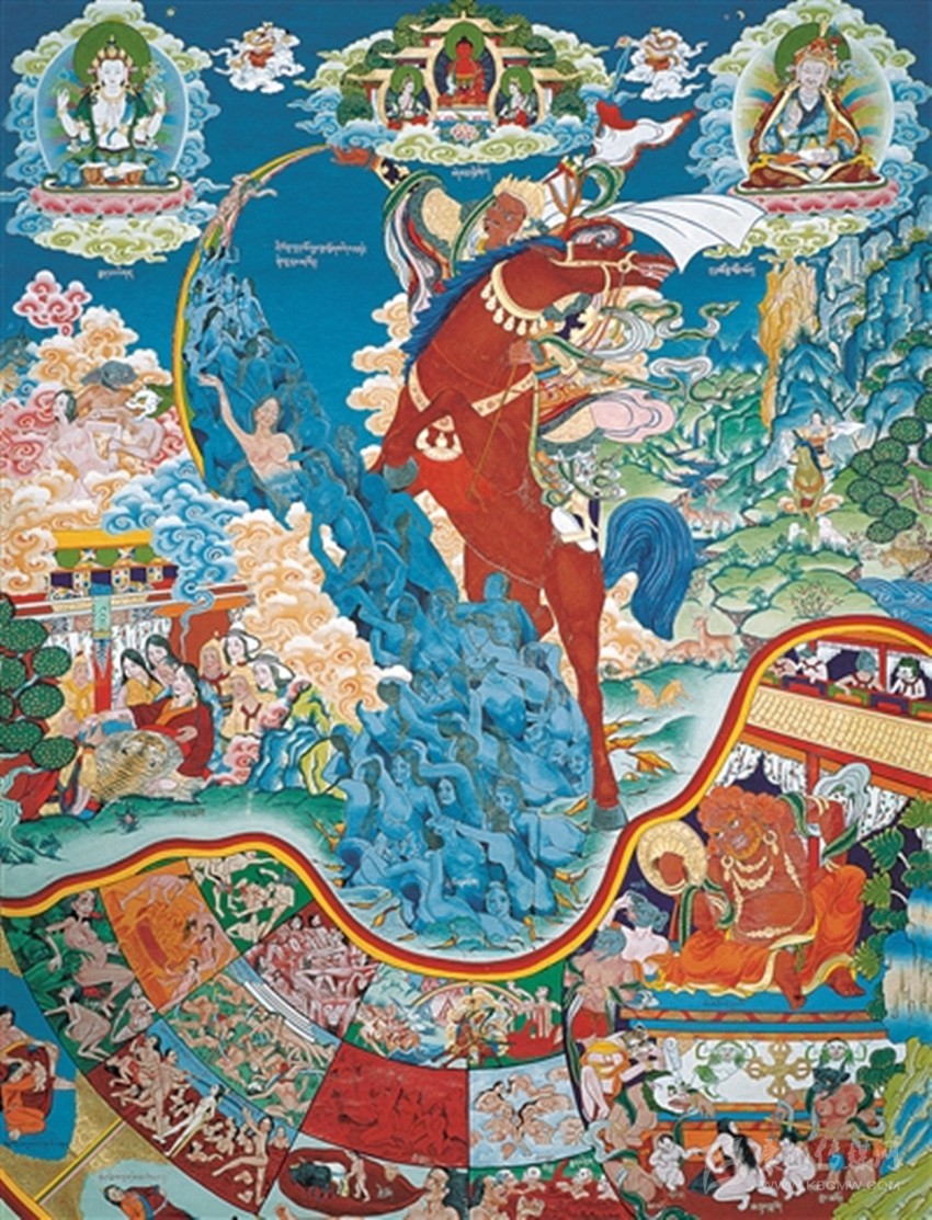 “下面地獄完成業(yè)果”,是說(shuō)格薩爾完成使命,拯救墜入地獄的母親、妻子,嶺國(guó)的眾英雄,以及一切受苦受難的眾生,超度他們的亡靈,然后返回天界。