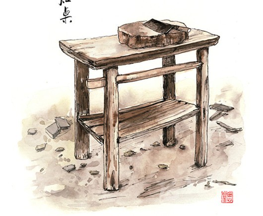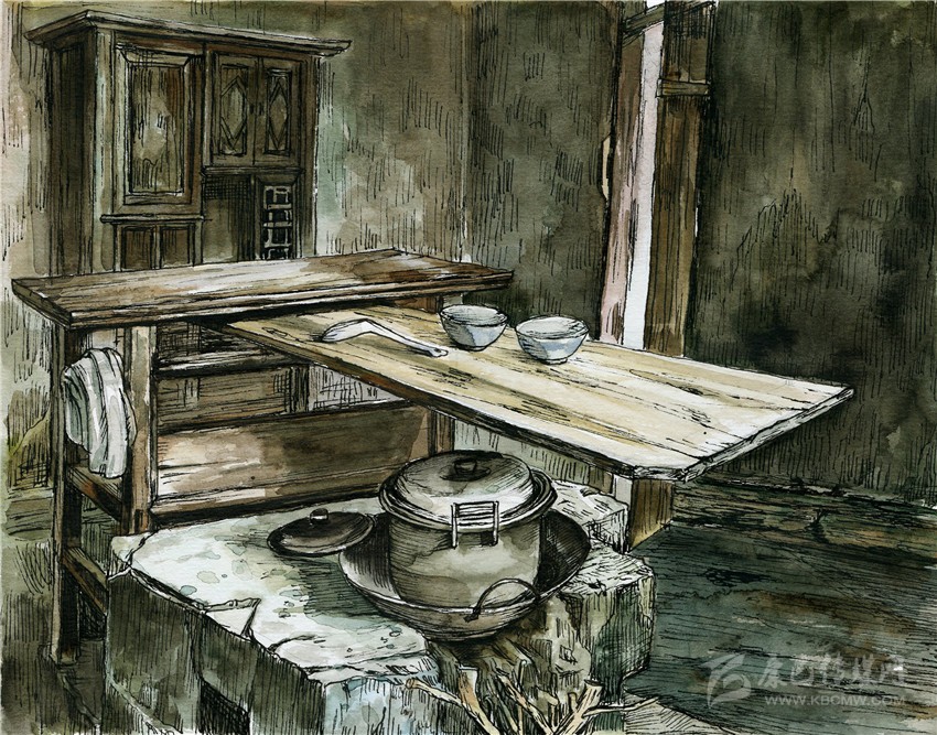 在我們家,灶屋里砌著一個(gè)四方形兩灶孔的大正灶,兩條寬板長(zhǎng)凳靠墻擺放,交于墻角,像木匠的大曲尺,半圍著象征一家之主的正灶,其中一條正對(duì)著灶門(mén)口。灶與凳之間的通道,僅容曲膝而坐。灶上常年擱著烏黑的鼎灌和鐵鍋,灶的背面則立著一張長(zhǎng)條狀的灶桌。灶桌是洗碗和切菜的地方,在其橫長(zhǎng)的縫隙里插上接手板,懸空于灶面之上,擺上碗筷,又起到了飯桌的功能。灶屋進(jìn)門(mén)的另一面墻,靠墻而立的,是高高的碗欃和一個(gè)瓦水缸。碗欃是平素放碗放剩菜的地方,本是漆了老紅色,卻因西墻的木格窗小,光線(xiàn)幽暗,與四壁及樓板的烏黑融為了一體。水缸上口有一塊擱板,板上放兩只寬口瓦缽,缽里各放著一只竹筒水勺,一大一小。每天早晚,家人擔(dān)了木桶,挑來(lái)井水倒入水缸,此處的地面,長(zhǎng)年潮濕。灶屋是我們一日三餐吃飯喝茶休息閑談的場(chǎng)所,煙火歲月,多是在此度過(guò)。我開(kāi)蒙上小學(xué)后,每到夜晚,吃過(guò)飯后,將煤油燈盞移到寬板長(zhǎng)凳,雙膝跪地,伏在凳灶之間的空隙里寫(xiě)作業(yè),有時(shí)一不小心,額前頭發(fā)就被燈盞的火焰燒得焦臭。我自小愛(ài)學(xué)習(xí),成績(jī)很好,每學(xué)期都有獎(jiǎng)狀,老師夜里來(lái)村間家訪時(shí),也常來(lái)我家坐,是我父母最大的榮光。