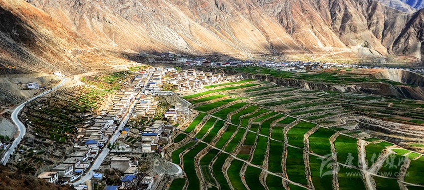 從得榮縣城出發(fā),途經(jīng)日龍鄉(xiāng),汽車順著盤山公路開(kāi)始往下行駛,到半山腰處,司機(jī)輕輕踩一腳剎車熄火,在此作短暫休息。這時(shí),我打開(kāi)車門俯瞰金沙江畔的因都?jí)危?jiàn)公路兩側(cè)一排排整齊的房屋像火柴盒一樣連綴在平坦壩子上,房屋下端,麥田梯次舒展,麥浪涌動(dòng),蔚為壯觀。
