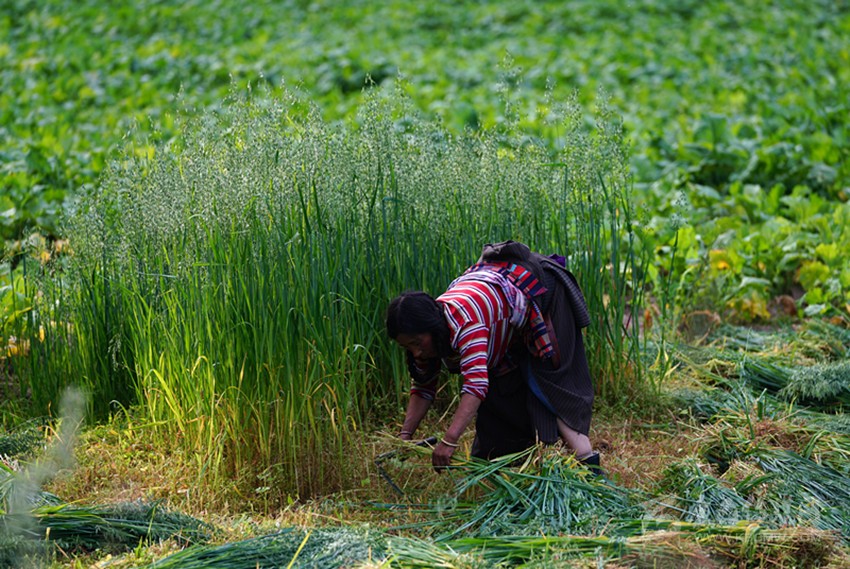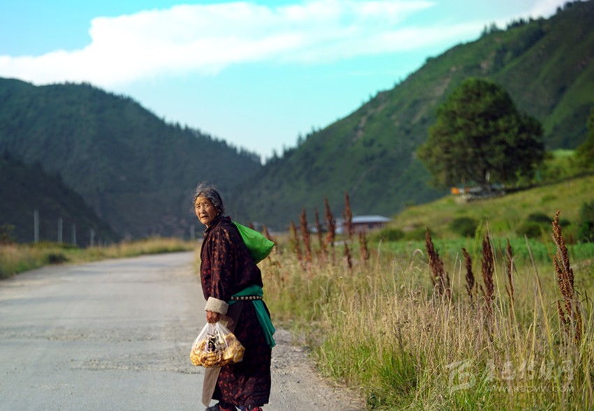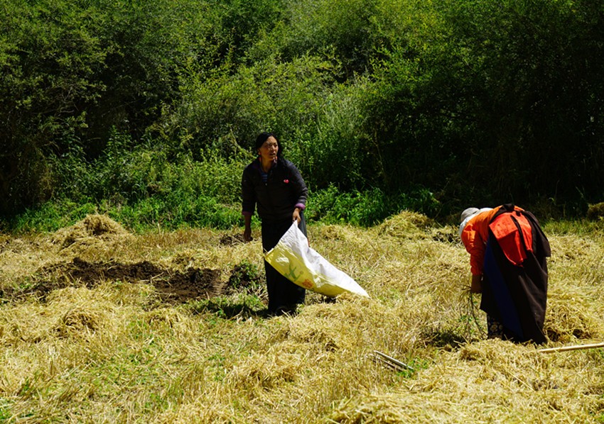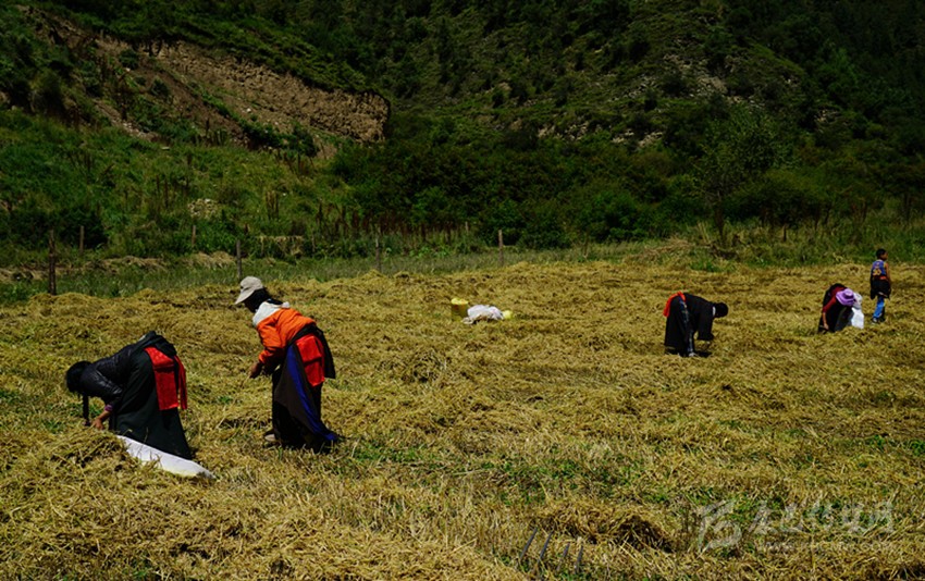 開始收割了,從坡地到川地,到處是收割機的聲音。青稞是車巴溝的主要作物,因為要磨青稞面,要吃糌粑。村里人忙得團團轉,收割機開過去,大家就跟在后面撿穗子。如此往復,一直要到糧食拉到家里。