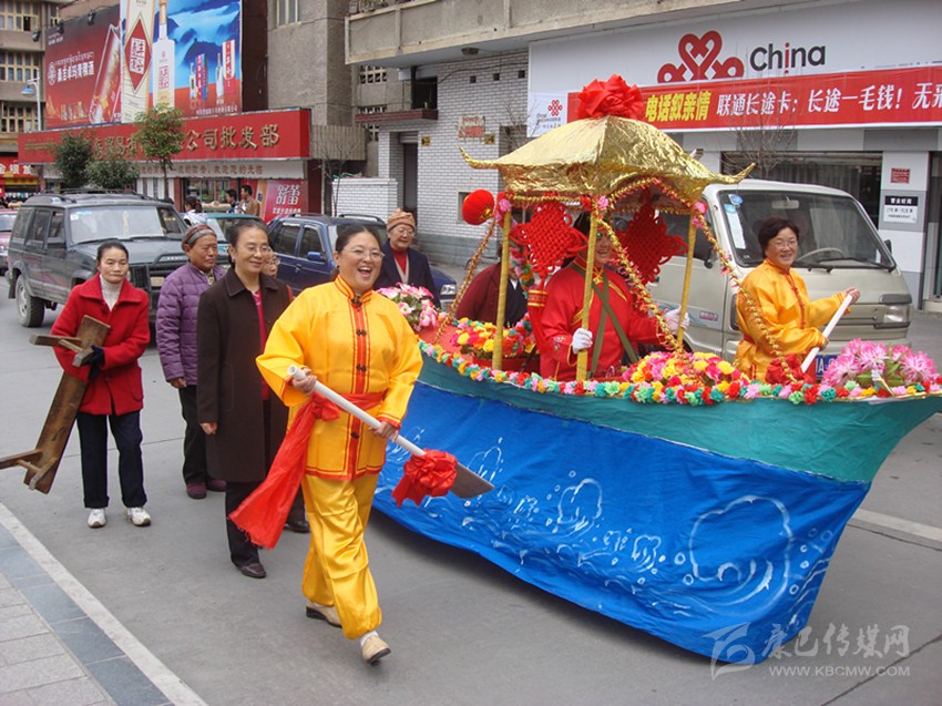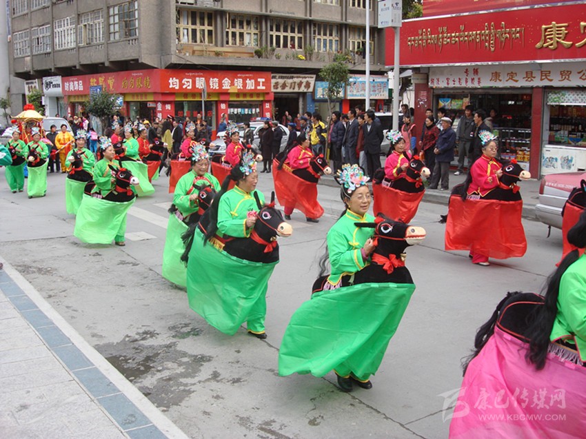 半個世紀風(fēng)靡康定城的“船燈”、“馬馬燈”、“鬧山鼓”、“扭秧歌”、“笑頭和尚戲柳翠”、“霸王鞭”……整個兒就像老陜過年時的“社戲”場面。大年初一、十五夜“出燈”游街,熱鬧氣氛把整個年節(jié)塞得滿滿的。記得我孩童時見過一次“出燈”游行,不是晚上而是在大白天(叫“出游”)。寺廟喇嘛吹奏佛樂走在前面,接著是“川北”人的川劇鑼鼓;再后面跟著的就是“馬馬燈”、劉老陜的“船燈”、鐵木社的“龍燈”、二輕局的“霸王鞭”、南門上的弦子隊、三居委的腰鼓隊、北三巷的“道孚鍋莊隊”……游行隊伍遇街口寬敞地方必圍圈演出。“人老啦,人老啦,人老先從頭上老,白的多來黑的少, 開——船——羅!”“銀須飄灑”的艄公劉老陜用俏皮逗趣的陜腔告白開場詞,在歡喜鑼鼓的伴奏中“劃”著旱船出了場。旱船闖“急流”、過“險灘”,風(fēng)趣又逼真;如果哪家的姑娘打扮成古裝戲里的嬌美仕女坐上旱船游了街,那她立馬就成了康定城人皆贊譽的“美女”。接著就是“馬馬燈”,幾十個“騎馬橫槍”的古裝將士馳騁上場,排兵布陣,穿梭并行,“馬”鈴聲鼓樂聲交織一起……鬧翻了康定城的“三山二水”。