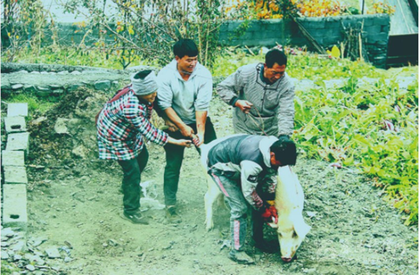 殺年豬是三埡人過年的重頭戲。清晨,家家戶戶的炊煙升起,此起彼伏的殺豬聲響徹村落。各家的院壩里,有的燒豬毛、開膛、剁肉,有的灌香腸、腌臘肉,大家分工明確,有序忙碌,不一會兒,小孩兒們就能吃到在火塘里烤熟的香腸、豬肝和豬腦花。