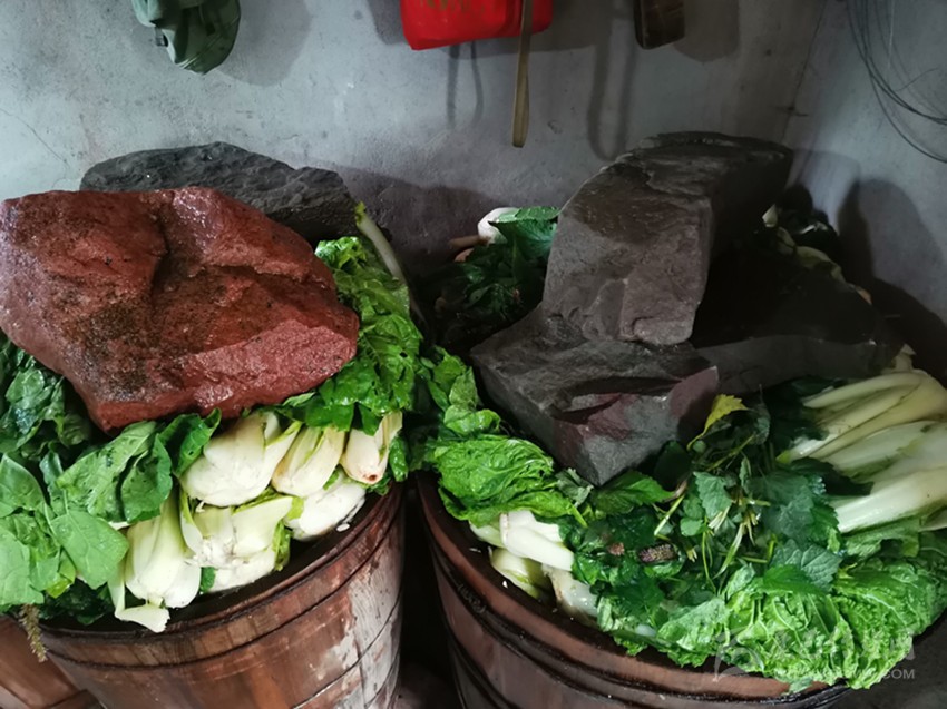 舊時(shí)化林坪家家都做鹽菜炒臘肉,為何李汝珍卻能在周家客棧的灶上烹調(diào)出這獨(dú)一份美味呢,原因就在這鹽白菜上面。據(jù)周家后人講述,李汝珍當(dāng)年對(duì)鹽白菜的制作頗為在行,從選材、抹料到腌制、晾曬,每個(gè)步驟每一種材料都非常講究。她用作腌菜的食材需葉片長肉質(zhì)厚的半包心本地大白菜,花椒粉則選用麻香味醇的漢源花椒,所需之水必須為本地山泉,她還特意在腌制時(shí)加入茴香苗、藿香葉等香料,在木桶或水缸上以巖石加壓更是匠心獨(dú)具。精心制作的鹽白菜,常常晾曬于客棧屋檐下或墻外各處,以其醇香之味吸引客人前來。久而久之,周家客棧鹽白菜的美味之名被背夫們帶到各地,“鹽白菜炒臘肉”也成了茶馬古道上的一道名菜。