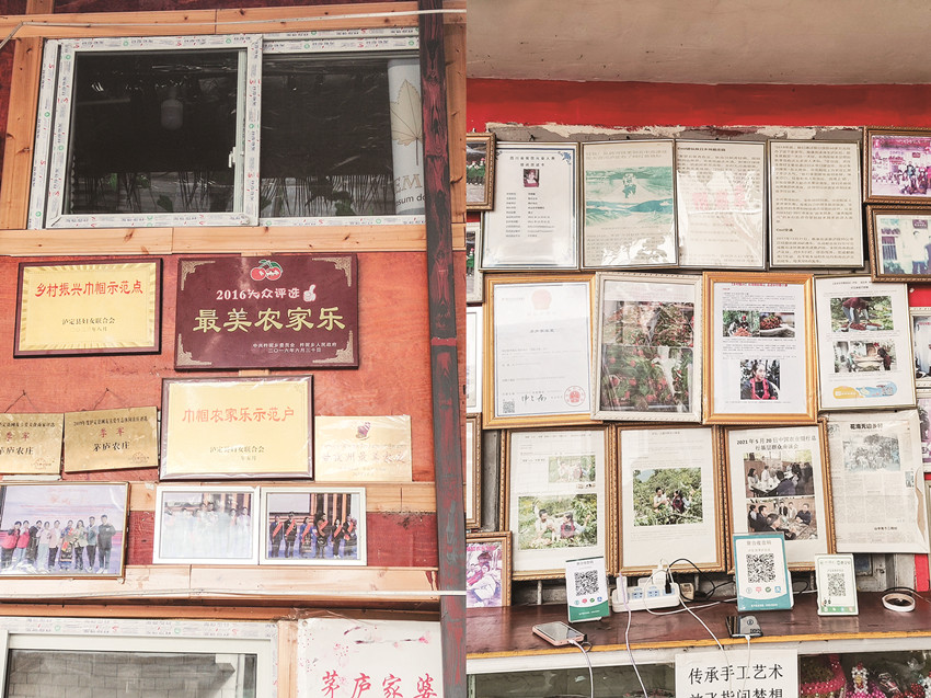 她說:“一開始,我的目的就是想掙錢,想要這個家庭擺脫貧困。在開辦這個農(nóng)莊之前,我家一直就在借債還債的循環(huán)中苦苦掙扎。天有不測風(fēng)云,2006年丈夫華建做心臟手術(shù),2007年又做膽息肉手術(shù),花光了四處借來的四萬多塊錢,丈夫出院回家后,不能外出打工,又要急著還人家的錢,在無計可施的時候,我們想到了搞養(yǎng)殖,養(yǎng)魚魚死光了,養(yǎng)雞倒是成功了,但是賣不出去,基本虧了個底朝天。我只好四處打工,但是基本上都處于入不敷出的尷尬境地?!?013年長子華啟明住院做脾裂手術(shù),2015年公公腦梗,又去州醫(yī)院手術(shù),好像前半輩子就是借錢、還錢,拆東墻補西墻,無可奈何。正當經(jīng)濟上緊張得不可開交,覺得山窮水盡時,國家出臺了鄉(xiāng)村振興戰(zhàn)略,她響應(yīng)國家號召,想到了回到家鄉(xiāng)開辦農(nóng)家樂。第一年,在“婦女創(chuàng)業(yè)”貸款8萬元、信用社貸款16萬元,把農(nóng)家樂勉強辦起來了。在幾年的經(jīng)營中,“茅廬農(nóng)莊”的口碑越來越好,在2016年被杵坭鄉(xiāng)授予“2016大眾評選最美農(nóng)家樂”,在2018年人氣美食商家網(wǎng)評選為“瀘定縣網(wǎng)友喜愛美食商家評選季軍”,2019年人氣生態(tài)評選網(wǎng)評選為“瀘定縣網(wǎng)友喜愛生態(tài)休閑農(nóng)莊評選季軍”?,F(xiàn)在,農(nóng)莊的生意越來越好,規(guī)模越來越大,家里的日子越來越好,一家人也過上了幸福的生活。