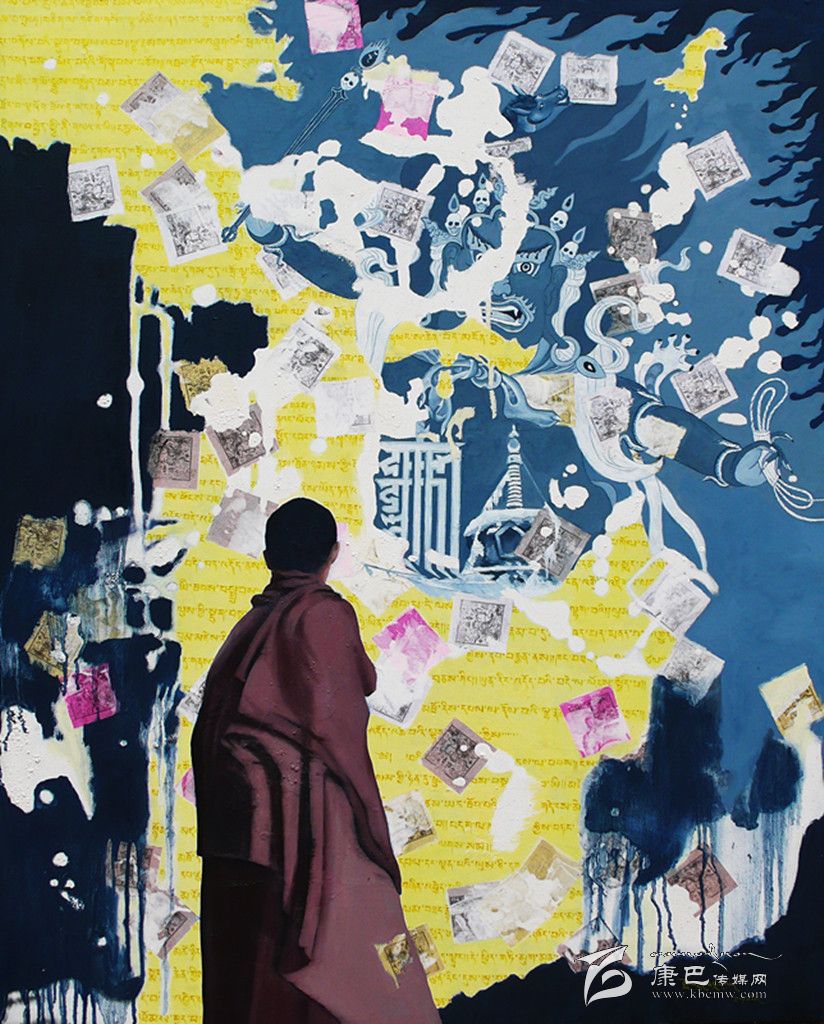 采用藏區(qū)題材做藝術(shù)的藝術(shù)家不在少數(shù),強(qiáng)調(diào)寫實(shí)、原汁原味是大部分藝術(shù)家的選擇,但生于康定的藝術(shù)家周韜卻有另一番更深入的認(rèn)識(shí)。與美國印第安藝術(shù)家Brad kahlhamer一樣,他用更加強(qiáng)烈動(dòng)態(tài)的視覺制造了一個(gè)魔幻世界,讓眾人熟悉的藏區(qū)元素在畫面上集中而豐富地跳躍起來,比如喇嘛、活佛、長辮子的藏族女人,甚至形狀怪異的骷髏!