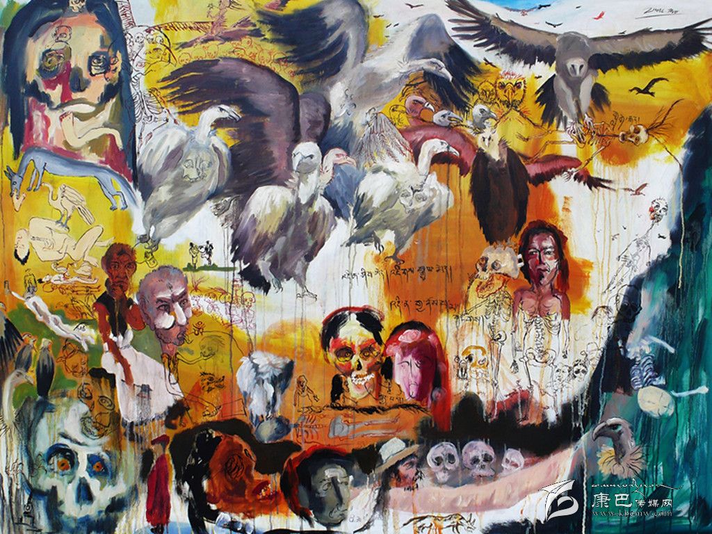 心態(tài)的豁達(dá)使周韜明確創(chuàng)作風(fēng)格后,很自然地創(chuàng)作了以藏區(qū)文化為主題的油畫系列,比如《沐浴節(jié)》、《活佛》、《天葬》、《女孩和她的夢》。比如,在《天葬》里周韜大量使用各種狀態(tài)的骷髏,對(duì)此他的理解是“從有些人來看,它可能代表了某種邪惡,但是從民族文化和精神層面來理解,它是藏區(qū)文化的一部分,也是藏族人對(duì)生命的一種觀看方式,比如藏戲和法會(huì)中就有專門的骷髏舞。”