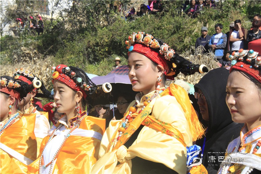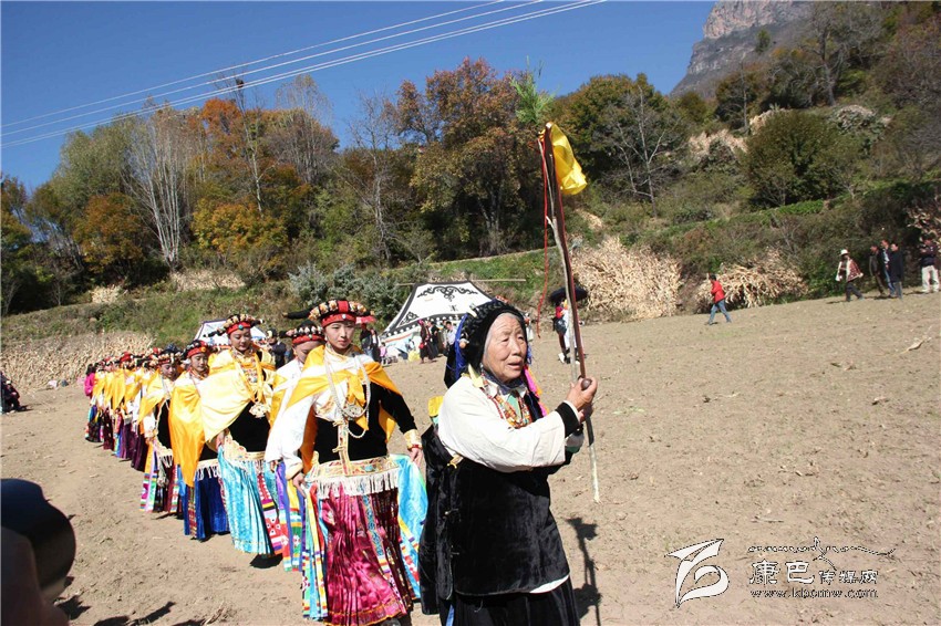 所有的祈福儀式結(jié)束后,村子里一位德高望重的長輩走上圓臺,用雄渾有力的嗓音向場地外等候的人們發(fā)出指令。在一段念詞結(jié)束之后,參加成人儀式女孩們的父親們在一位老人的指引下緩緩的向場地中央走來,老人手舉一幅一米高的唐卡畫,口中念念有詞,走在他后面的父親們一襲白色的毪衫,頭戴一頂灰色的禮帽,腳穿紅黑相間的藏靴,頸上掛著一根潔白的哈達(dá),滿臉肅然的緊隨老人之后,來到月形的臺子邊,站成一個半圓形。當(dāng)父親隊站定后,母親隊們也向場地中移步而來,本次成人儀式的主角們在一位老阿媽的帶領(lǐng)下向場地中走來,每一位女孩穿著打扮都是那么的光鮮靚麗,每一個人都顯得美麗動人,她們披著黃色的披風(fēng),一根白色的哈達(dá)在胸前打著結(jié),五顏六色的哈達(dá)懸掛在這根哈達(dá)上,在姑娘們的后背迎風(fēng)飄飛。走到圓臺邊,小女孩們也圍成半圓,低著頭,等待著喇嘛們的念經(jīng)祈福和家人的祈福。此時,兩位吉祥老人站了起來,手中拿著凈瓶,走到姑娘們面前,一邊念誦經(jīng)文,一邊將手中凈瓶里的水倒在姑娘們的手心里,姑娘們則虔誠的將這圣水輕輕的抹在自己的額頭上,寓意吉祥如意。待喇嘛主持儀式結(jié)束后,主持儀式的老人用嘉絨語向蒼天和墨爾多神山祈禱,希望神賜予孩子們美麗的面容和美好的心靈,從今日起,她們就可以真正的長大成人了。吉祥詞念誦完后,母親們排著長長的隊伍緩緩來到孩子們的面前,將懸掛在胸前的哈達(dá)取下,久久的凝視著女兒的臉,眼角掛著幸福的淚水,用顫抖的聲音為女兒祈福,叮囑孩子們要孝敬父母,做一個正直善良的人,然后,才將白色的哈達(dá)掛在女兒的頸上,父親們則站在原地,看著母親們將哈達(dá)和祝福送給女兒,見證著女兒們的長大成人。接受完父母和長輩們的祝福之后,盛大的鍋莊舞會開始了。小女孩們也跟隨著這些舞者們手牽著手走到場地中央,跳起歡快的鍋莊舞。擁忠大娘說,成年禮上的鍋莊舞會一般都要視參加成人禮儀式女孩們親戚多寡而定,每一名長輩都會走到場地中牽頭,跳起舞蹈,這時候是女孩的長輩們炫耀舞技和歌聲的時候,他們矯健的舞步和甜美的歌喉迎來眾人的和鳴。