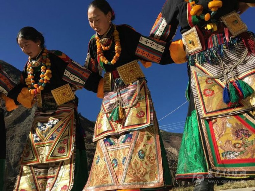 蒙自鍋莊服飾獨(dú)特,屬東義服飾類(lèi)。稻城東義女式服飾感覺(jué)與鄉(xiāng)城瘋裝有些相似,融合了納西族女裝和稻城土裝的元素,一是折疊多、折疊數(shù)是固定的,內(nèi)折和外折各54個(gè),左右胸襟分別以紅黃綠黑等顏色的料子鑲拼而成,分別代表財(cái)富、福壽、牲畜、先知、土地。男式服裝比較簡(jiǎn)便,突出之處就是系在腰間的彩帶。