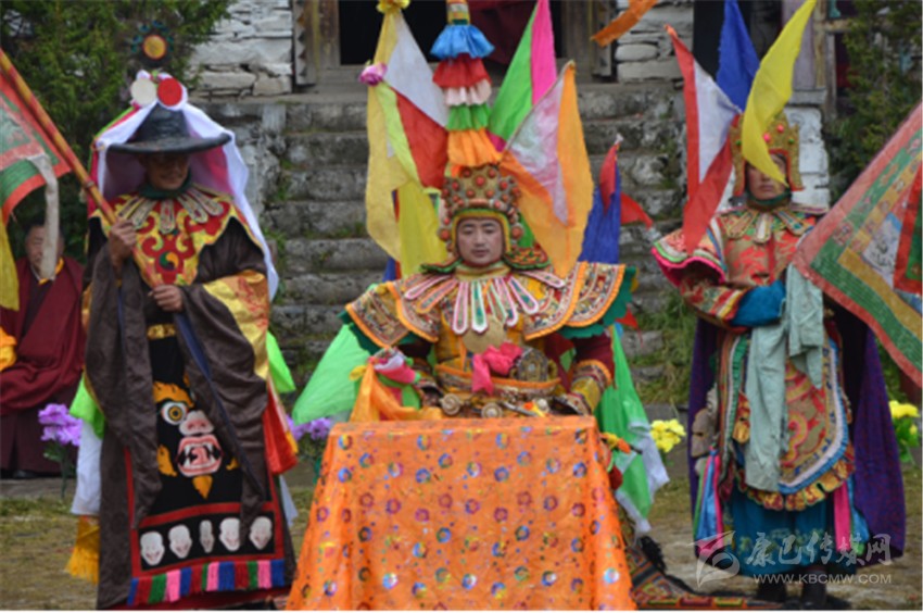 思路還是回到戲劇問題上來,在我以往欣賞的藏戲,其演出場所都設在露天,演員和觀眾在同一平臺的草地上,有時在平臺四周有山坡,那便是觀眾最好的看戲處。不過,從高處往低處看,效果還是不及平視的效果好。表演藏戲的舞臺在草地中央,觀眾圍著中央草地形成一個半包圍圈,演出幾乎沒有布景,即便有,也是簡單的一些桌椅、祭臺之類的簡單道具。在演出中,一個演員身著各類色彩鮮艷的帽、旗及其盔甲服裝等大于人體體型的飾物,這樣做的目的顯然是為了增強演出的鮮明性,尤其演員穿著厚底高靴,體型龐大,頭戴面具,嗓音洪亮,動作凝重而富有節(jié)奏,使整個演出富有較強的穿透力和沉重感。藏戲的音樂也比較簡單,主音節(jié)奏依靠長號、大鼓、鈸等,曲目轉(zhuǎn)換時則多以笛子演奏,間或插入海螺聲、嗩吶聲等。整個藏戲的故事情節(jié)則是依靠舞蹈和合唱來漸次推進的。藏戲作為祖國文化大家庭中的成員之一,自然有著自己獨特的特點,有著屬于自身的文化藝術和生活土壤的傳承因子。藏戲誕生在一個特殊的環(huán)境里,它既在風格、形態(tài)、特征和韻致上包含著與其他戲劇相似的共通性,同時,它又蘊涵著與眾不同的自身的內(nèi)涵特征??傊貞蛟凇案?、舞、劇、技等方面的有機結合,虛擬寫意的表現(xiàn)型戲劇,程式化表演手段,自由靈活的演出時空概念,??????它又具有與古希臘戲劇很類似的貫穿始終的講解人和伴唱伴舞隊,面具表演,三面以至四面觀眾的廣場演出,一部分生活化寫實表演,演出時空的間接固定場景,史詩式講唱文學的劇本結構和說唱藝術的演出格式等特殊之處?!薄緞⒅救骸吨袊貞蚴贰?/span>4頁】因此,在藏戲的諸多元素中,我們可以看到顯著的特征,這就是明顯的原始巫文化和原始苯教文化的痕跡,無論是在藏戲的臺詞、面具和服飾中,還是在藏戲的音樂、樂器和表演形式上,不難看出藏戲的這一本土特征,至于與其他戲劇流派的類似之處,我以為,一方面是戲劇本身固有特征的表現(xiàn),另一方面或許是一種合理吸納所致。