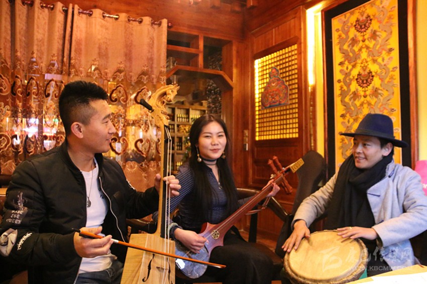 其美(中)和朋友交流樂器使用技巧。