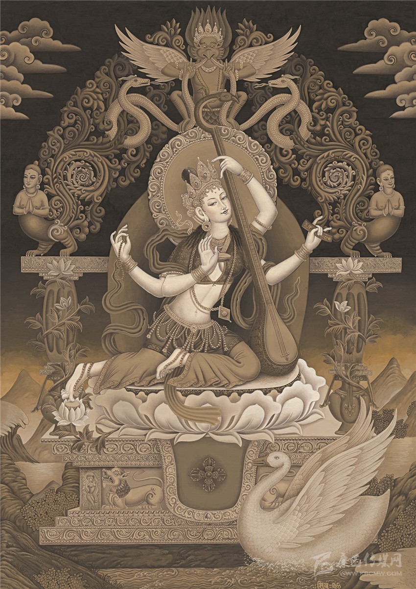 (一)對比色調(diào):畫面顏色干凈,對比強烈,大多用對比色來彰顯力量;施金華麗、燦爛而不泛濫。(二)暗色調(diào):畫面明度較低,常用黑色、藏青、絳紅、深綠來調(diào)劑各類原色,使得畫面色彩沉郁中透露出清新、凝重中綻放出優(yōu)雅,色彩的過渡細(xì)膩而豐富。(三)素色調(diào):尼瓦爾唐卡最有特色的就是“素色調(diào)”的唐卡(簡稱“素唐”)。筆者之所以稱其為“素色調(diào)”而不稱作“黑白”或“單色”,是因為畫面雖然沒有明顯的色彩,但是也非單一的黑色或灰色。它不僅調(diào)配了從深到淺的許多色階;還有雅致的黃灰、曠遠(yuǎn)的藍(lán)灰、宏大的紅灰等諸般色相的交響以及微妙的冷暖搭配,整體呈現(xiàn)出夢幻般的美感。