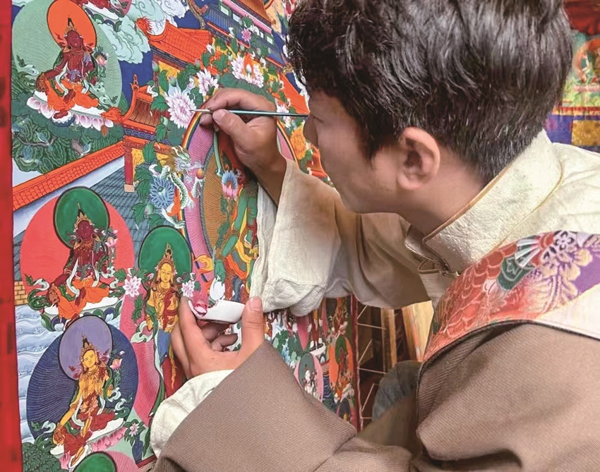 “唐卡作為中國民族繪畫藝術(shù)的珍品,不僅呈現(xiàn)精湛的技藝和美學(xué),更是傳遞一種文化?!睏畹潜硎?,他作為一名縣級(jí)非遺傳承人,要在繼承傳統(tǒng)技藝的基礎(chǔ)上,采用多元藝術(shù)技藝賦予傳統(tǒng)唐卡更多創(chuàng)意,讓民族文化瑰寶能夠更好地發(fā)揚(yáng)光大。