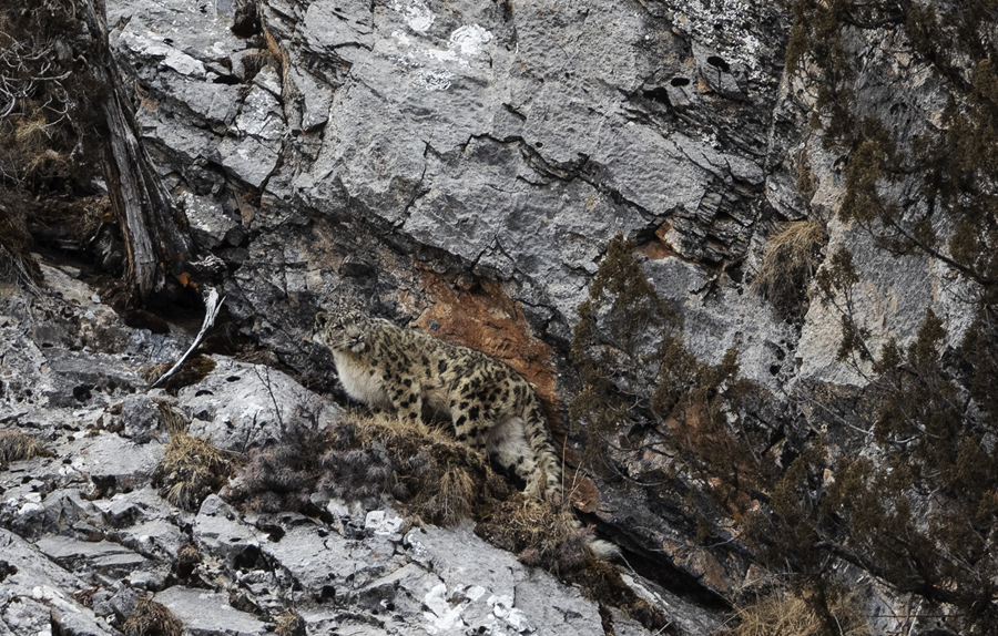 ??2023年2月21日,在青海省玉樹藏族自治州雜多縣昂賽鄉(xiāng)境內(nèi)的昂賽大峽谷內(nèi),一只雪豹準(zhǔn)備向上攀爬。新華社記者 費(fèi)茂華 攝