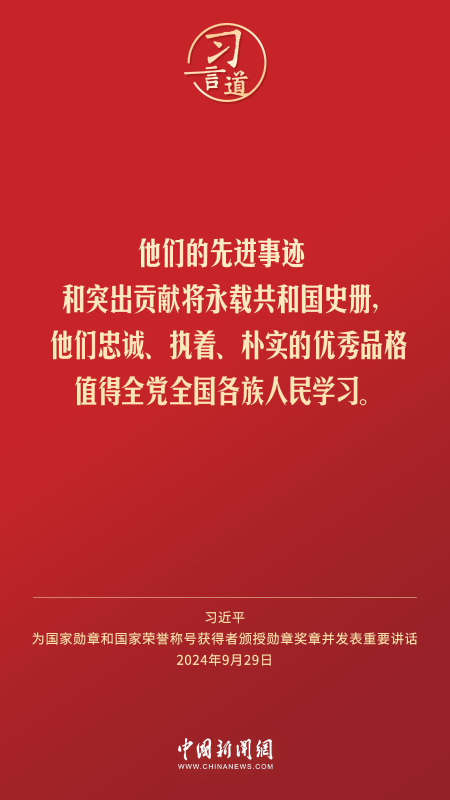 經(jīng)中共中央批準(zhǔn),中華人民共和國國家勛章和國家榮譽(yù)稱號頒授儀式于9月29日上午10時在人民大會堂隆重舉行。中共中央總書記、國家主席、中央軍委主席習(xí)近平向國家勛章和國家榮譽(yù)稱號獲得者分別授予“共和國勛章”“友誼勛章”和國家榮譽(yù)稱號獎?wù)虏l(fā)表重要講話。習(xí)近平指出——