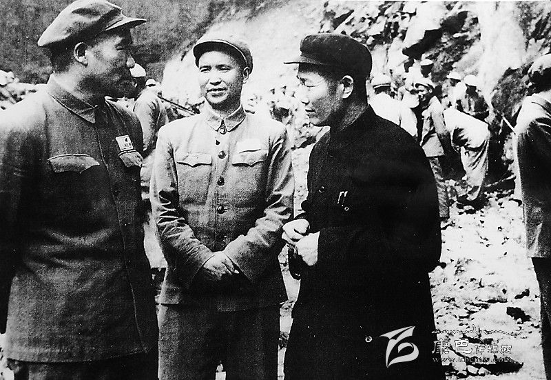 1953年秋,西南軍區(qū)副司令員李達(dá)代表賀龍司令員慰問(wèn)川藏公路筑路部隊(duì)和職工,這是陳明義(中)陪同李達(dá)(左)在波密視察公路進(jìn)展情況。 (資料圖片)