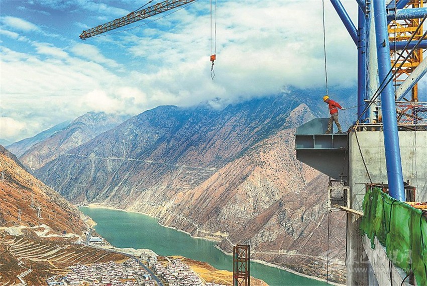 瀘定大渡河興康特大橋是雅康高速公路的重點(diǎn)控制性工程之一,是一座建在高海拔、高地震烈度帶上的超大跨徑鋼桁梁懸索橋,采用鋼混疊合橋道系,造價(jià)超過10億元,因建設(shè)技術(shù)難度大被譽(yù)為“川藏第一橋”。兩岸主墩索塔高188米,塔頂至河面垂直高差364米,橋橫跨大渡河,但在河中沒有橋墩,采取的是懸索橋設(shè)計(jì),在兩岸修建兩塔、兩錨,作為支撐和受力,橋面以懸索拉伸。未來,大橋?qū)⒁?/span>1100米的超長跨徑連通大渡河兩岸,變天塹為通途。 (何海洋 攝影報(bào)道)