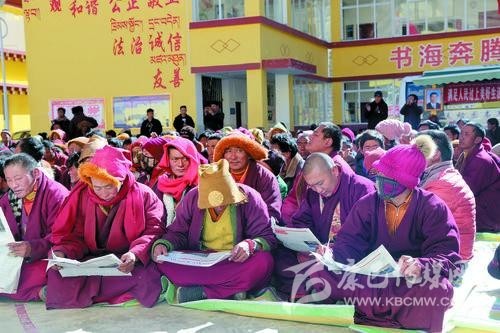 在白玉縣的宣講現(xiàn)場(chǎng),《甘孜日?qǐng)?bào)》藏文版成了“搶手貨”。