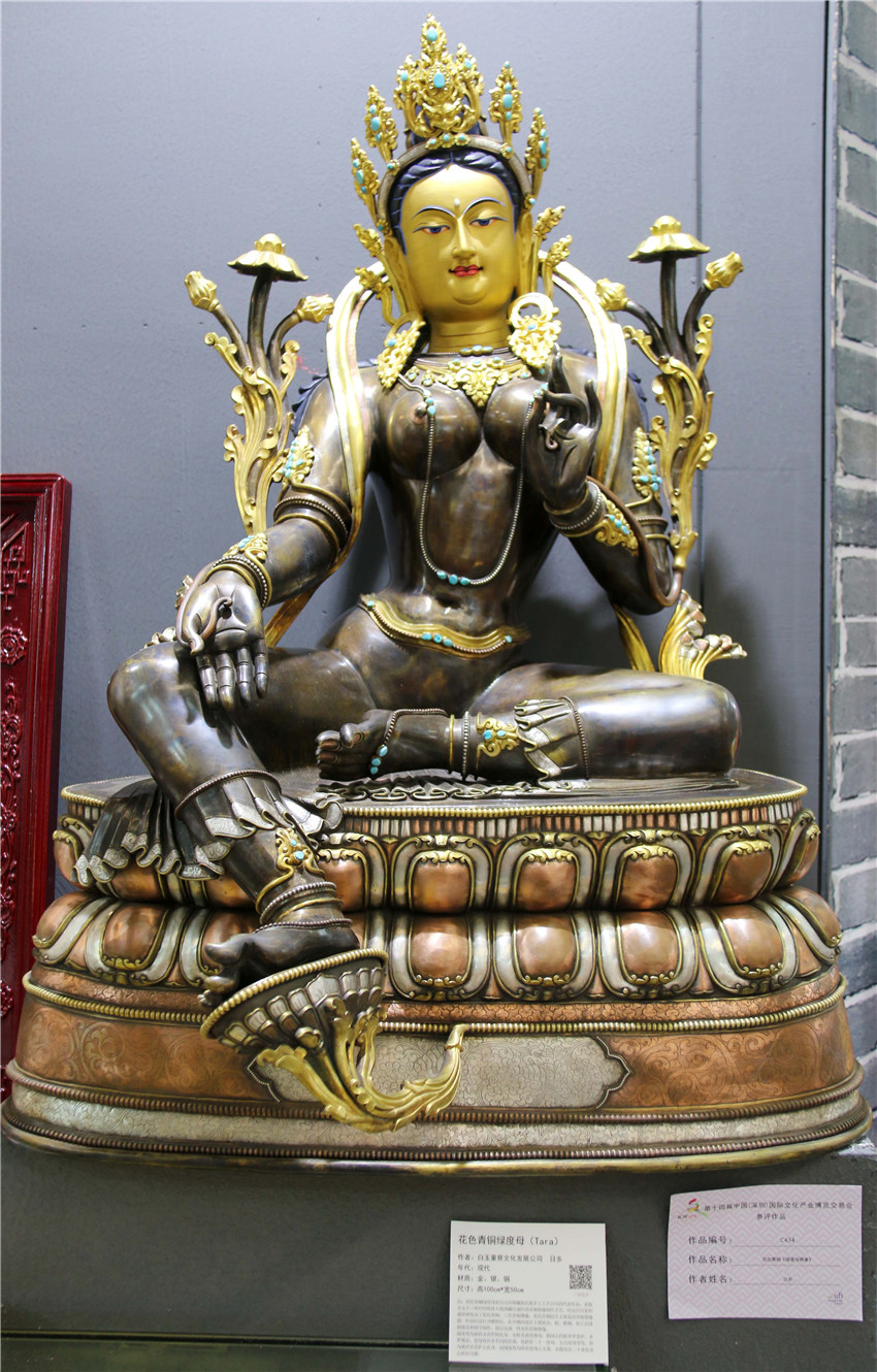 本網訊(記者 宋志勇 文/圖)“這是由什么材料鑄成的物件?”“這件作品的寓意是什么?”“這是一件花色青銅《綠度母佛像》,分別由金、銀、銅鑄成,高100cm、寬50cm,綠度母為觀世音菩薩的化身。”5月12日是第十四屆中國(深圳)國際文化產業(yè)博覽交易會第三天,甘孜展館迎來了眾多參觀者,在館內市民正與白玉縣董察文化發(fā)展有限責任公司董事長日多一問一答。