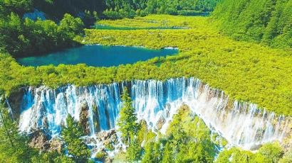 重建實踐彰顯生態(tài)理念——九寨溝景區(qū)內(nèi),尊重自然、綠色修復(fù)的舉措不勝枚舉。地震后,諾日朗瀑布出現(xiàn)一條16.8米長的裂縫,僅剩一股急流。景區(qū)就地取材,用地震中垮塌的鈣化物來填補“漏水”的裂縫,豐水期時,諾日朗瀑布恢復(fù)了昔日壯觀景象。