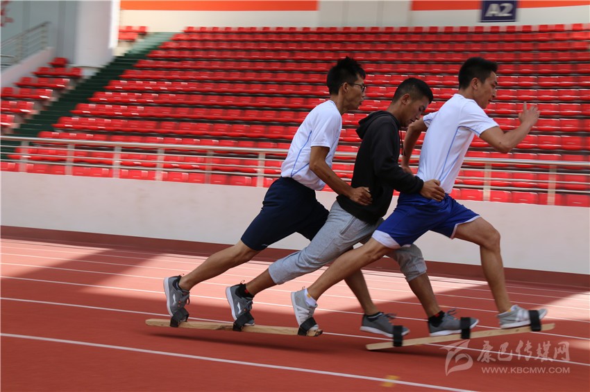 “啪,啪,啪……”,在高腳競速訓(xùn)練場地的對面,板拍打地面的聲音有節(jié)奏地在賽道上回蕩著。記者看到4組板鞋競速隊正在有序訓(xùn)練,每隊有三名運動員,他們都把腳套在一個木板鞋上,后面的兩個運動員把手放在前一個運動員的腰上,三個人齊心協(xié)力,喊著有節(jié)奏的口號,彼此邁著統(tǒng)一的步伐為了共同的目標(biāo)而前進(jìn)。每一組的隊員都是齊心協(xié)力,好像他們已然融為一體,步伐的頻率和擺臂的頻率都是一致的,絲毫沒有違和感。