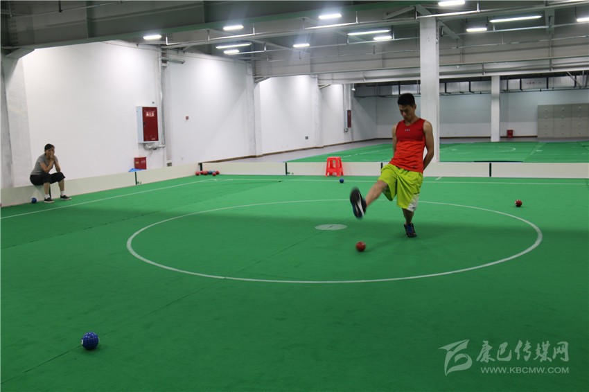 記者隨后被工作人員帶到了蹴球訓(xùn)練場地,只見在一個10米×10米的正方形平地上,一個運動員腳跟著地,用腳掌擠壓球,去擊中場內(nèi)球。