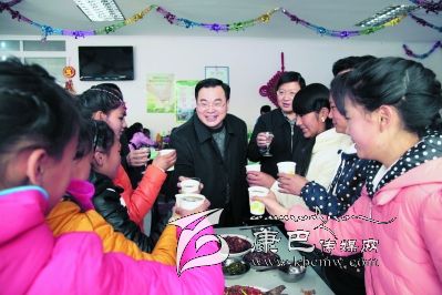 胡昌升斟滿酒杯一桌一桌地敬大家,祝福大家春節(jié)愉快、萬事如意。胡昌升動情地說,尊敬的各位老師、親愛的同學(xué)們,大家春節(jié)好!今天我和你們的汪洋爸爸、忠義爸爸和大家歡歡喜喜過除夕,在這里我要感謝所有的老師們,正是因為你們辛勤的工作,用心用情地關(guān)心孩子們,所以孩子們的臉上綻放出了幸福的笑容,你們把福利院當(dāng)成自己的家,愛校如家,愛孩子們?nèi)缱?,你們用心用情、嘔心瀝血、殫精竭慮,今天我要感謝你們,感謝全州所有的老師們。
