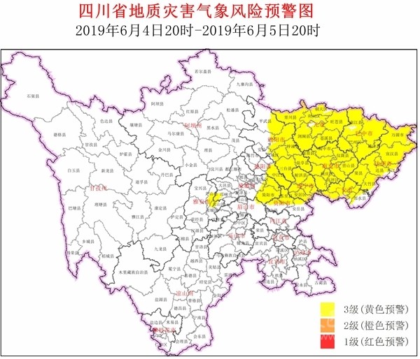 四川在線消息(記者 寇敏芳)6月4日,省自然資源廳發(fā)布全省地災(zāi)氣象風(fēng)險預(yù)警。結(jié)合四川省氣象臺天氣預(yù)報(bào)情況,6月4日20時~6月5日20時,全省地質(zhì)災(zāi)害氣象風(fēng)險預(yù)警等級為3級(黃色預(yù)警,注意級),具體結(jié)果如下: