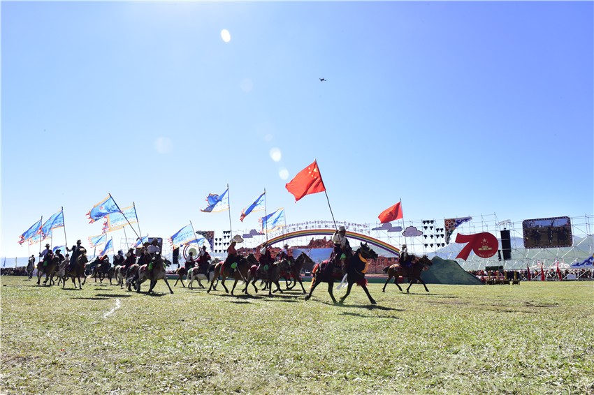 “四山旗似晴霞卷,萬(wàn)馬蹄如驟雨來”。上午十點(diǎn),石渠縣四個(gè)片區(qū)組成的四個(gè)馬隊(duì)方陣高舉印有“世界最美濕地”“千年唐蕃古道”“石刻藝術(shù)王國(guó)”“吉祥太陽(yáng)部落”字樣的四色彩旗,眾星拱月般簇?fù)碇腥A人民共和國(guó)國(guó)旗和慶祝中華人民共和國(guó)成立70周年活動(dòng)標(biāo)識(shí),策馬入場(chǎng),拉開了2019中國(guó)·石渠—太陽(yáng)部落帳篷狂歡節(jié)的帷幕。