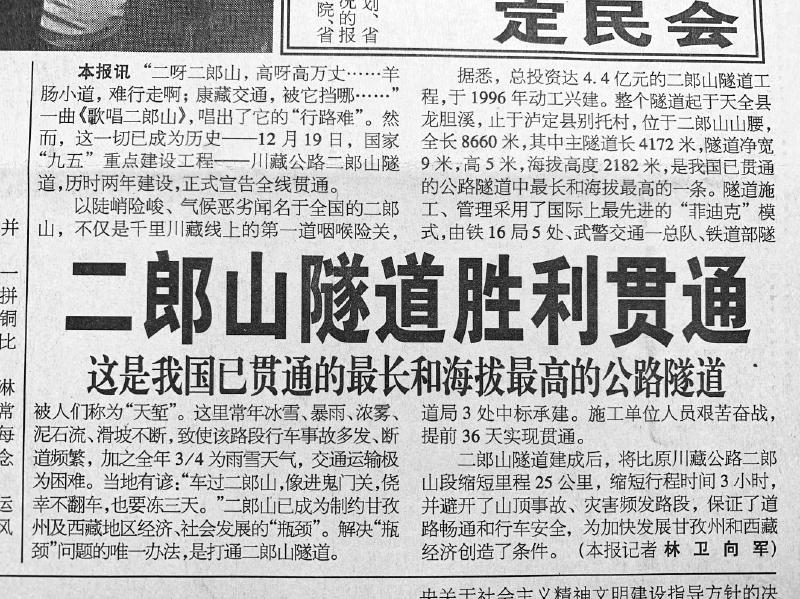 21年前,二郎山隧道打通后,川藏公路翻二郎山從原來海拔2800米的埡口降低到海拔2200米的隧道,避開了最危險的路段,節(jié)省3小時行程,行車更安全。林衛(wèi)當(dāng)時寫下2000余字的通訊《洞開希望》,將二郎山隧道的打通比喻為“為藏區(qū)經(jīng)濟(jì)騰飛插上了金色的翅膀”。