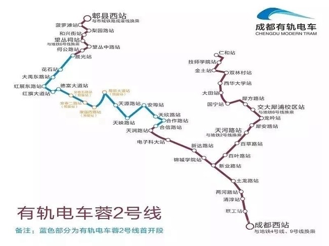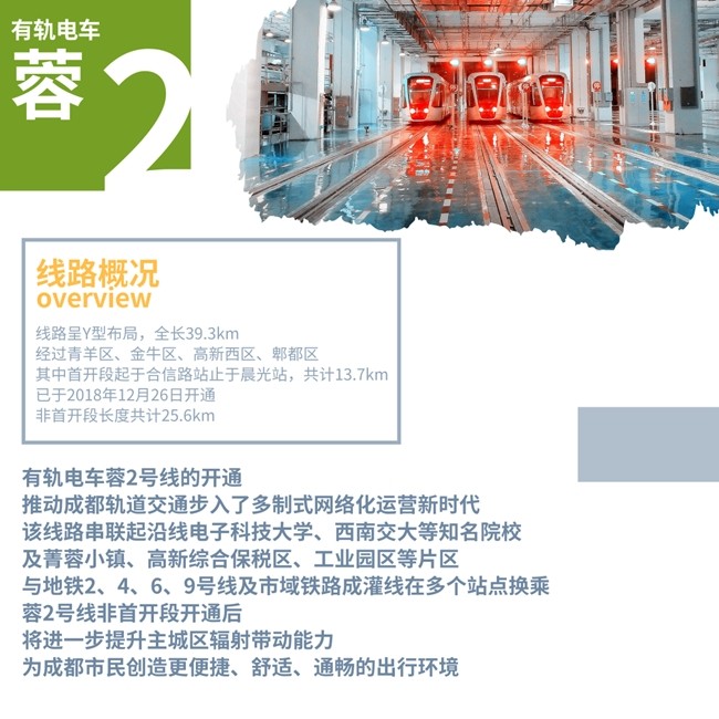有軌電車蓉2號(hào)線工程線路呈Y型布局,線路經(jīng)過青羊區(qū)、金牛區(qū)、高新西區(qū)、郫都區(qū),線路全長(zhǎng)39.3km。其中首開段起于合信路站,止于晨光站共計(jì)13.7km,已于2018年12月26日開通,非首開段長(zhǎng)度共計(jì)25.6km。