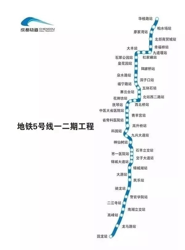 5號(hào)線一二期線路全長(zhǎng)49.02km,設(shè)車站41座,其中地下站36座,高架站5座,換乘站4座(5號(hào)線開通時(shí))。其中,一期工程由華桂路向南引出至騎龍站,二期工程由騎龍站向南引出至回龍站。