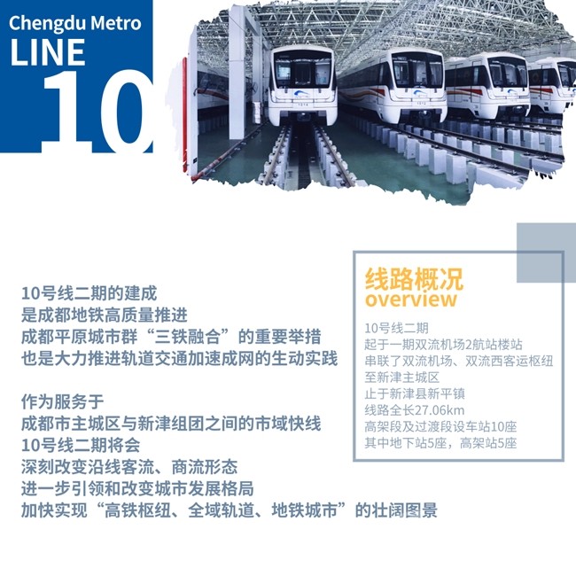 10號(hào)線二期起于一期雙流機(jī)場(chǎng)2航站樓站,串聯(lián)了雙流機(jī)場(chǎng)、雙流西客運(yùn)樞紐至新津主城區(qū),止于新津縣新平鎮(zhèn),線路全長(zhǎng)27.06km,高架段及過渡段設(shè)車站10座,其中地下站5座,高架站5座。
