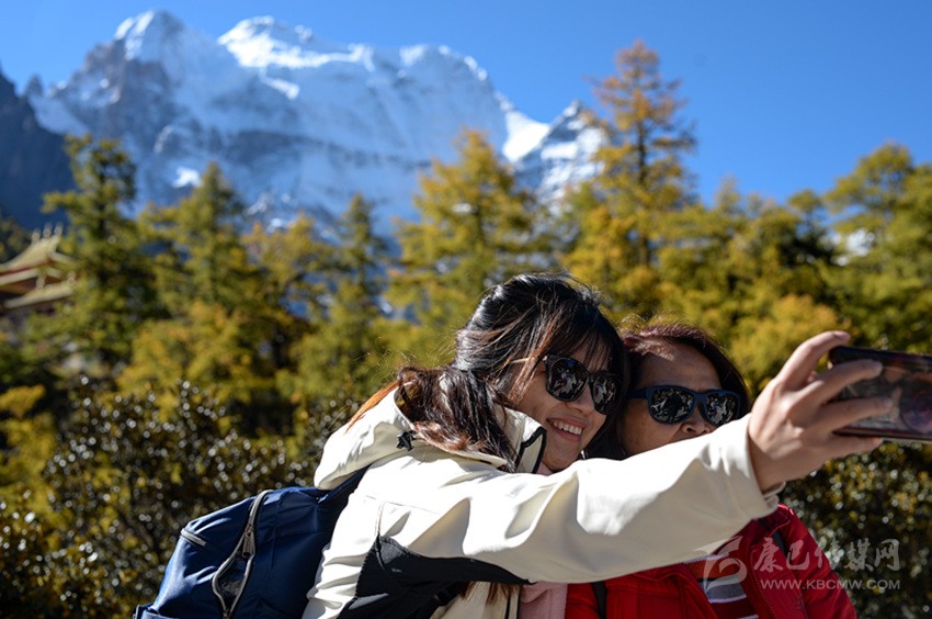 稻城亞丁景區(qū)位于四川省甘孜藏族自治州稻城縣香格里拉鎮(zhèn)。深秋時節(jié),亞丁風(fēng)景區(qū)內(nèi)層林盡染、碧空澄澈、雪山巍峨,形成一幅美不勝收的畫卷。 圖為10月20日,在亞丁景區(qū),游客在拍照合影。 新華社發(fā)
