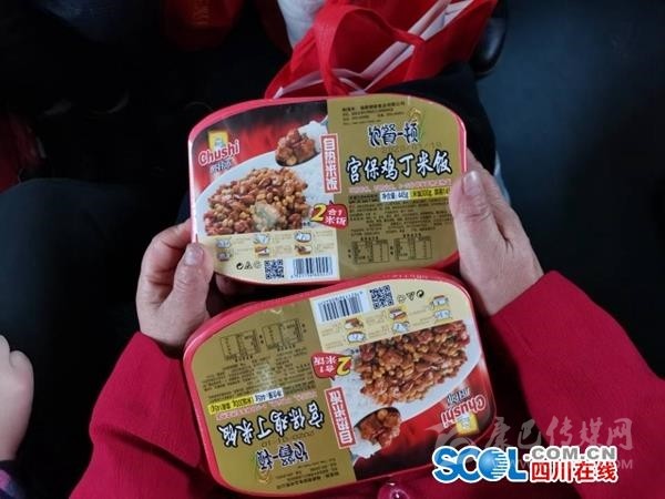 18日中午12時, 列車出發(fā)2小時后,巴中恩陽人鄔兵領(lǐng)到了來自家鄉(xiāng)的午餐——一盒自熱米飯,配菜是宮保雞丁?!安诲e不錯,今年不用吃方便面了。”端上米飯的鄔兵笑了笑。