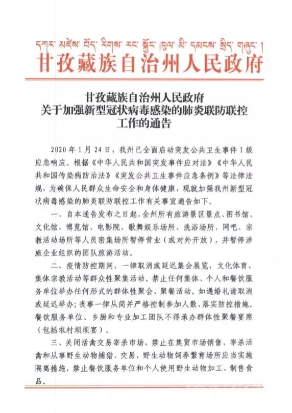 甘孜藏族自治州人民政府關(guān)于加強新型冠狀病毒感染的肺炎聯(lián)防聯(lián)控工作的通告