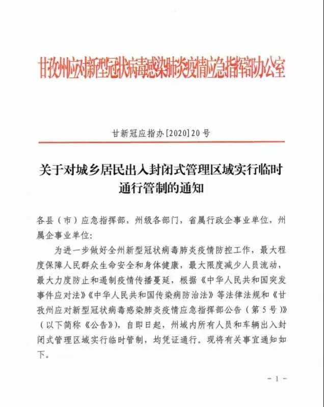 為進(jìn)一步做好全州新型冠狀病毒肺炎疫情防控工作,最大程度保障人民群眾生命安全和身體健康,最大限度減少人員流動最大力度防止和遏制疫情傳播蔓延,根據(jù)《中華人民共和國突發(fā)事件應(yīng)對法》《中華人民共和國傳染病防治法》等法律法規(guī)和《甘孜州應(yīng)對新型冠狀病毒感染肺炎疫情應(yīng)急指揮部公告(第5號)》(以下簡稱《公告》),自即日起,州域內(nèi)所有人員和車輛出入封閉式管理區(qū)域?qū)嵭信R時管制,均憑證通行。現(xiàn)將有關(guān)事宜通知如下。