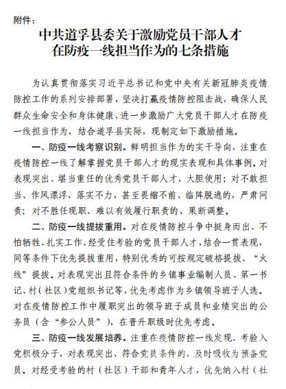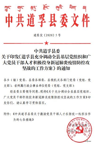 疾風(fēng)知?jiǎng)挪?,板蕩識(shí)誠臣。自新型冠狀病毒肺炎疫情防控阻擊戰(zhàn)打響以來,道孚縣各級(jí)黨組織和黨員、干部主動(dòng)擔(dān)當(dāng)作為,積極投入疫情防控最前線,為有力防控疫情蔓延作出重要貢獻(xiàn)。近日,道孚縣委印發(fā)《中共道孚縣委關(guān)于激勵(lì)黨員干部人才在防疫一線擔(dān)當(dāng)作為的七條措施》,關(guān)心關(guān)愛、激勵(lì)引導(dǎo)廣大黨員、干部、各類人才在疫情防控一線履職盡責(zé)、擔(dān)當(dāng)作為、安心戰(zhàn)斗。
