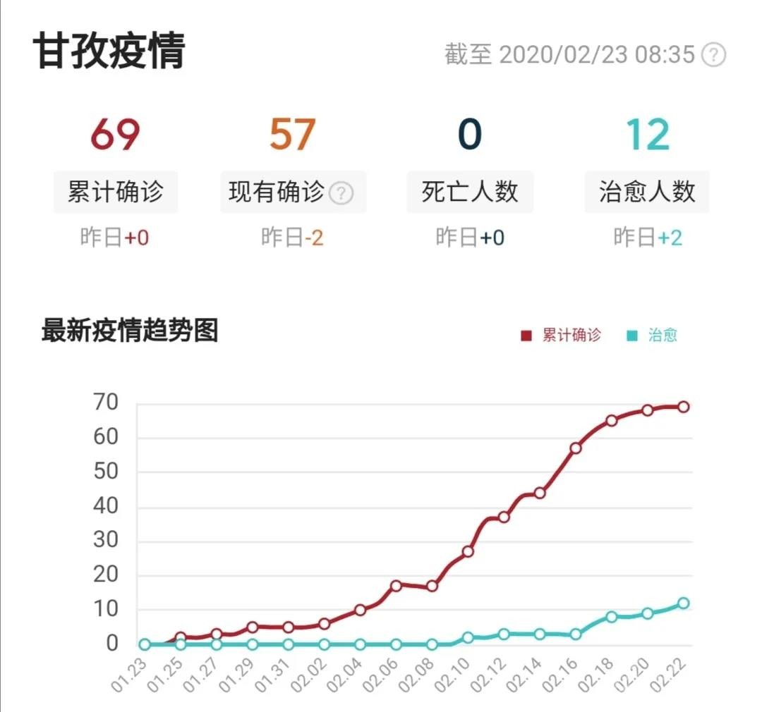 截止2月22日24時,我州累計報告新型冠狀病毒肺炎確診病例69例(道孚64例、康定2例、色達(dá)2例、稻城1例),其中治愈出院12例,在治重癥5例,危重癥1例,其余患者病情穩(wěn)定,均在定點醫(yī)院接受治療。其中,男性39例,女性30例,最大的77歲,最小的3歲。