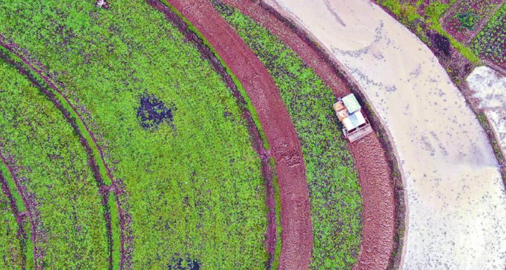 尋聲而去,記者看到一臺(tái)旋耕機(jī)正在一塊水田間緩慢行駛,刀片把枯黃的稻根、嫩綠的野草一并打碎,泥花飛濺,激起土里特有的潮味兒。