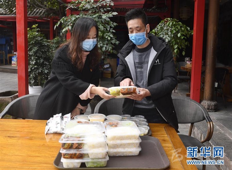 “女子服務(wù)隊(duì)”工作人員沈娜(左)向成都市金牛區(qū)“寇家大院”餐廳執(zhí)行店長陳心華了解盒飯配送情況(2月28日攝)。新華社記者 劉坤 攝