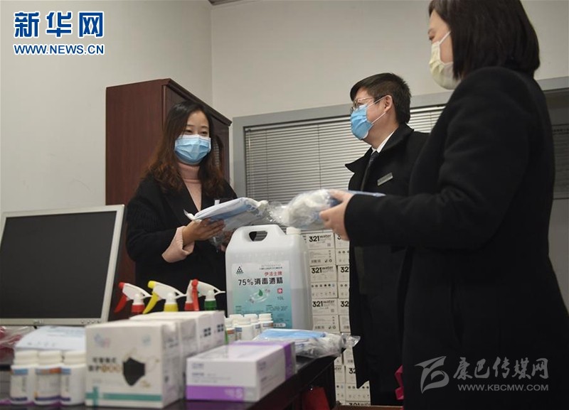 “女子服務(wù)隊(duì)”工作人員沈娜(左)向成都市金貿(mào)大廈物管公司管理人員了解防疫物資準(zhǔn)備情況(2月28日攝)。 新華社記者 劉坤 攝