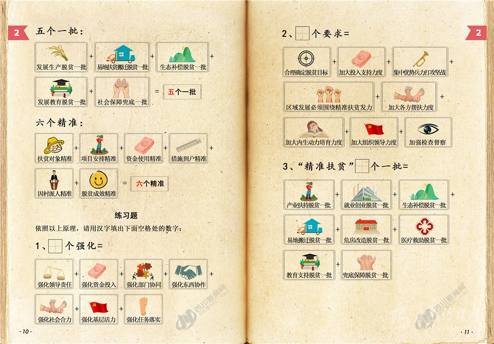 四川新聞網(wǎng)成都8月26日訊 又是周三啦?說好的脫貧攻堅(jiān)小課堂如期而至!目前,打贏脫貧攻堅(jiān)戰(zhàn)進(jìn)入最后沖刺的關(guān)鍵階段,四川還有很多硬仗要打,很多“硬骨頭”要啃,防止返貧致貧任務(wù)繁重,脫貧攻堅(jiān)工作力度還需要加強(qiáng),面臨的困難和挑戰(zhàn)依然十分艱巨。為了深入推進(jìn)精準(zhǔn)扶貧精準(zhǔn)脫貧,奪取全省脫貧攻堅(jiān)收官之戰(zhàn)全面勝利,本課采用上一課剛剛學(xué)到的數(shù)字來總結(jié)歸納了脫貧攻堅(jiān)政策和方法的關(guān)鍵知識點(diǎn),以便讓廣大同學(xué)進(jìn)一步掌握這些政策、運(yùn)用這些方法,提高政策受益覆蓋面及知曉率,確保各項(xiàng)政策落到實(shí)處。