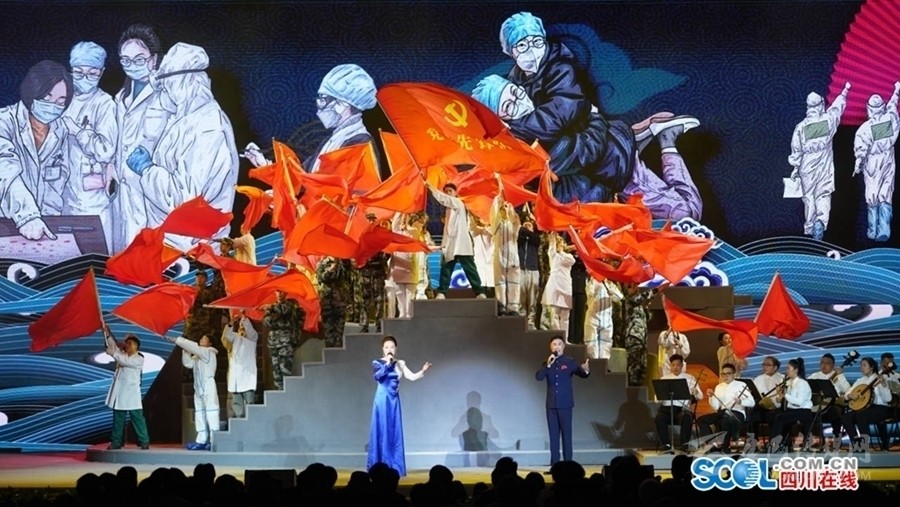 19時(shí)30分許,在催人奮進(jìn)的陣陣鼓聲中,開幕式正式開始。胡和平在致辭中表示,第六屆中國詩歌節(jié)在四川省和重慶市兩地一同舉辦,是落實(shí)黨中央推動(dòng)成渝地區(qū)雙城經(jīng)濟(jì)圈建設(shè)決策部署的務(wù)實(shí)之舉,也是以文化繁榮為經(jīng)濟(jì)社會(huì)高質(zhì)量發(fā)展賦能助力的務(wù)實(shí)之舉。剛剛閉幕的十九屆五中全會(huì)把文化建設(shè)放在突出位置,明確“十四五”時(shí)期文化建設(shè)目標(biāo)要求,提出到2035年建成文化強(qiáng)國的遠(yuǎn)景目標(biāo)。廣大文藝工作者要以習(xí)近平總書記關(guān)于文藝工作的重要論述精神為遵循,貫徹落實(shí)黨中央關(guān)于文化工作的各項(xiàng)決策部署,堅(jiān)持以人民為中心的創(chuàng)作導(dǎo)向,堅(jiān)持與時(shí)代同步伐,發(fā)時(shí)代之先聲、頌時(shí)代之精神,用心用情用功抒寫偉大時(shí)代,推出更多謳歌黨、謳歌祖國、謳歌人民、謳歌英雄的精品力作,推動(dòng)社會(huì)主義文化繁榮興盛,為實(shí)現(xiàn)中華民族偉大復(fù)興中國夢(mèng)凝聚文化力量。