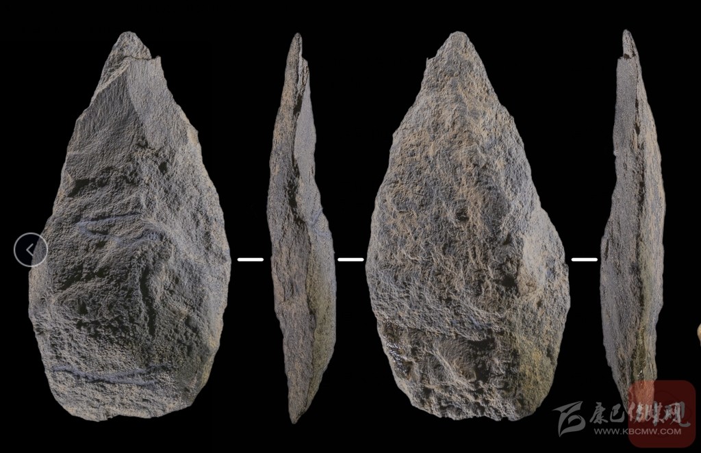 這塊有一端很尖的石頭,據說叫小型兩面器,看上去和手斧有點像,但比手斧小很多,目前在國內舊石器時代尚屬首次發(fā)現。原來,它就是從石塊上打下的石片經過加工后而成。它的邊緣頗為鋒利,端部尖銳,同樣具有切割、鉆孔等多種功能。