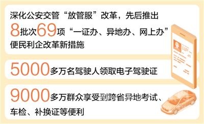 公安交管“跨省通辦”改革深入推進(jìn),駕駛證“全國通考”、機(jī)動(dòng)車“全國通檢”等改革措施全面落地,已有9000多萬群眾享受到跨省異地考試、車檢、補(bǔ)換證、處理交通違法等便利,減少多次往返,更好適應(yīng)人員、貨物、車輛大流動(dòng)的新形勢。