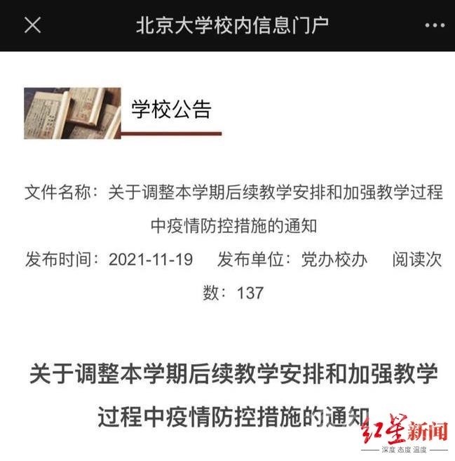 如北京大學(xué)日前發(fā)布通知,學(xué)生自2022年1月7日起放寒假;中國(guó)人民大學(xué)明確自2022年1月4日至9日期末考試,自2022年1月10日起,學(xué)生放寒假;北京物資學(xué)院稱(chēng),學(xué)生寒假自2022年1月9日開(kāi)始。紅星新聞?dòng)浾咦⒁獾?,根?jù)校歷顯示,三所高校原計(jì)劃自2022年1月17日放寒假,放假時(shí)間均比原計(jì)劃提前一周左右。