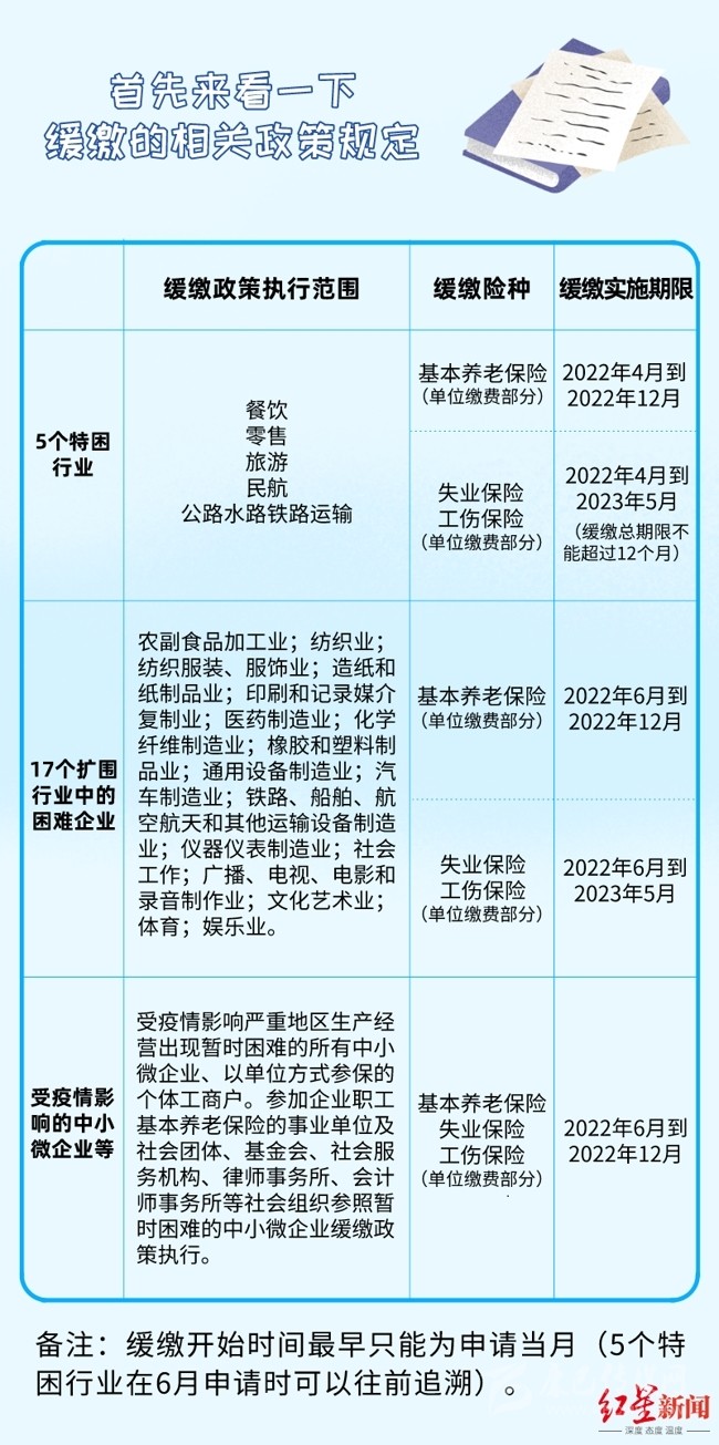 在緩繳期限方面,對(duì)餐飲等5個(gè)特困行業(yè)緩繳養(yǎng)老保險(xiǎn)費(fèi)期限延長(zhǎng)至2022年12月31日。對(duì)17個(gè)緩繳擴(kuò)圍行業(yè)所屬困難企業(yè),養(yǎng)老保險(xiǎn)費(fèi)緩繳實(shí)施期限至2022年12月31日,工傷、失業(yè)保險(xiǎn)費(fèi)緩繳期限不超過(guò)1年。緩繳期間免收滯納金。