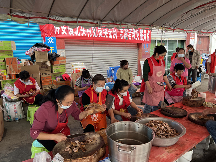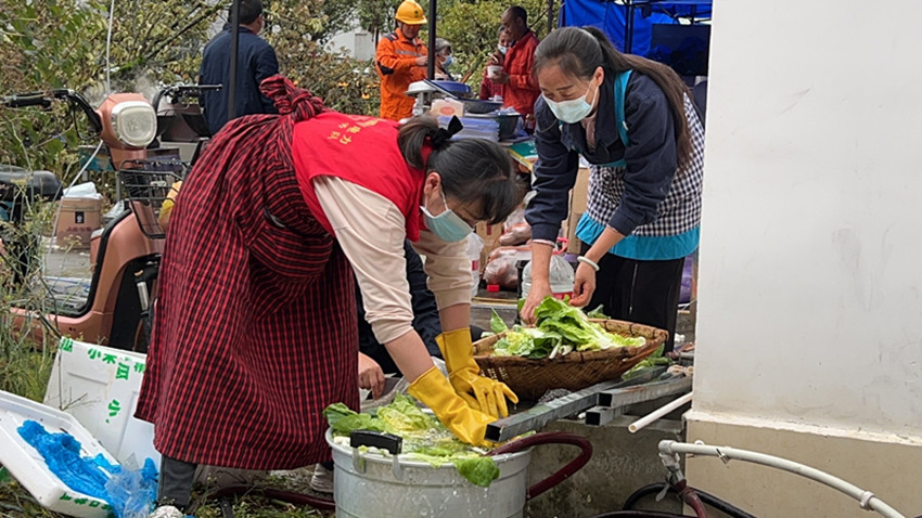 在得妥鎮(zhèn)北頭村的路旁,來自瀘定縣冷磧鎮(zhèn)桐子林村的李星芳和其他志愿者一起忙著切菜煮飯。她告訴記者,地震發(fā)生后,我主動報名加入志愿者團隊?!拔覀冞@個點上除了政府發(fā)放的物資,還有很多附近村民和好心人送來的菜肉和水果,大家都在用自己的行動出一份力?!闭诿χ胁说闹驹刚吆樾l(wèi)群說。就在記者采訪時,在北頭村開飯館的易姝宏一家送來了鹵菜、排骨和新鮮蔬菜,記賬員茍有成忙著清點數量并記錄在冊。“地震后,爸媽把年邁的奶奶送到瀘定縣城孃孃家,我也向單位請了假,今天我們一起趕回來在這里幫忙”。