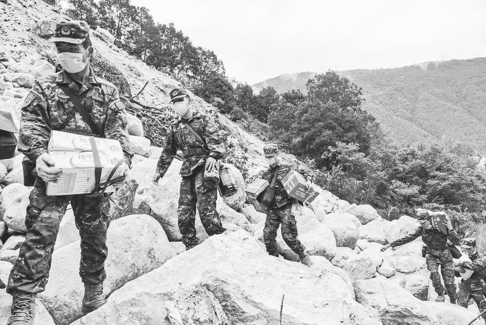 在地震發(fā)生后的48小時(shí)內(nèi),救援隊(duì)伍拼盡全力在水流湍急的河面搭設(shè)便橋,在不可能通行的地方,奮力開辟出一條生命通道,一箱箱應(yīng)急救援物資靠肩扛人背送往共和村,部分急需轉(zhuǎn)移的鄉(xiāng)親被一支支救援隊(duì)伍及時(shí)送到安全地帶,妥善安置。