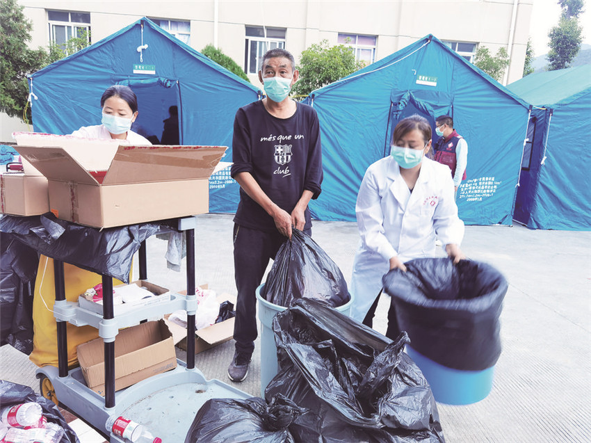 傷員多、搶救頻,大量傷員及家屬的聚集導致醫(yī)院醫(yī)療垃圾和生活垃圾量大增,醫(yī)療垃圾是平時的三四倍,生活垃圾更是以往的十倍。為了保持清潔,祝錫琴隨時關注著接診點,只要有垃圾就立刻清除。后來,垃圾太多,一個人無能為力,祝錫琴又叫來了兒子齊秦做志愿者,協(xié)助清除垃圾。